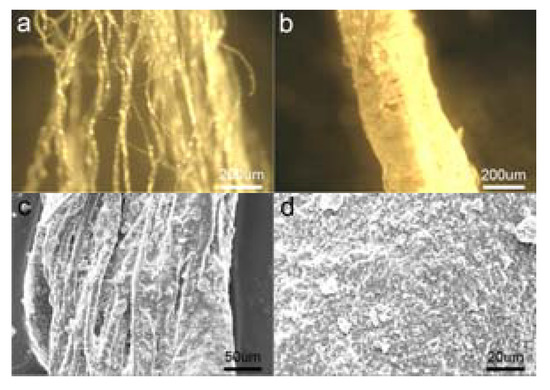 Optical microscope photographs of the cotton fibers and the coated fibers (a,b). The SEM photographs of the coated fibers (longitudinal section c) (transverse section d).