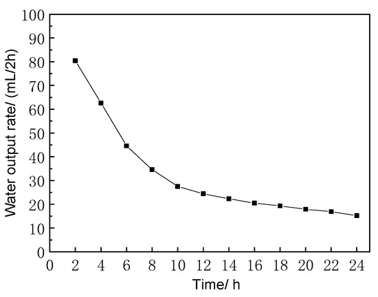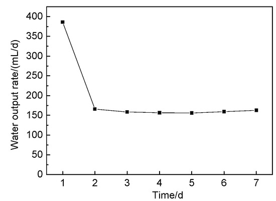 As Figure 7 shows, the average water output of the emitters showed a sharp change within 24 h. A maximum of 80 mL/h was achieved in the first two hours. Then the water output speed decreased rapidly until the 10th hour with a water output of 27 mL/2 h. After that, the decline slowed down and the water output rate remained about 20 mL/2 h, until it declined to a minimum of 15 mL/2 h at the 24th hour. Figure 8 shows the changes of water outputs over a week. In the first day, the water output was 386 mL, then it declined and remained around 160 mL/d from the second day. According to Figure 7 and Figure 8, the emitters could self-reduce the water output speed when the external soil moisture content increased.