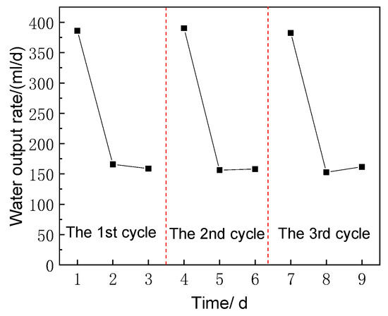 Figure 9 shows the three dry-wet cycles of the emitters. As shown, the water output declined from 384 mL/d to 155 mL/d and tended to be stable in the first cycle, which indicated that the emitters could self-reduce the water output speed when soil moisture content increased. When the soil moisture content decreased in the second cycle, the water output recovered immediately to 388 mL/d, which meant that the emitters could self-hasten the water output speed when soil moisture content decreased. Overall, the three cycles showed that the wet-dry alternating performances of the emitters were good, which indicated that the non-pressure infiltrating irrigation system could indeed self-regulate the water-conducting rate according to the external soil moisture.