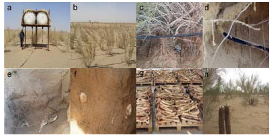 The photos in deserts: (a–d) the design of non-pressure infiltrating irrigation system; (e) the Cistanche deserticola parasitic on the roots of Sacsaoul; (f) the successfully inoculated Cistanche deserticola; (g) the Cistanche deserticola harvest; (h) the Cistanche deserticola flowering.