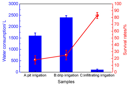 Desertification is one of the most threatening problems for humans in the 21st century [1]. The global desertification area has reached 36 million square kilometers and keeps increasing by 1.1% every years [2]. At present, the commonly used sand fixation technologies mainly include engineering sand fixation, chemical sand fixation and biological sand fixation [3]. By laying “grass grids”, engineering sand fixation could establish sand barriers to block the forward movement of wind-driven sand with low cost. However, its protection height is limited and it is easy to be buried by quicksand, so it can only be used as a temporary auxiliary technology in highway and railway construction [4]. By spraying sand-fixing agents, chemical sand fixation can consolidate the sand layer and it has quite good sand fixation effect [5]. However, its durability is poor because of the use of polymer materials, which age easily. Among all the existing measures, the most thoroughgoing method is biological sand fixation, which is mainly based on the planting of sand-fixing seedlings to fix the loose sand [6]. However, it is limited in the practical promotion because of its high cost. In deserts, the natural precipitation is not enough for plant demands, so artificial irrigation is essential, resulting in the high cost of biological sand fixation [7]. So, it is necessary to develop water saving irrigation techniques, such as drip irrigation and infiltrating irrigation [8,9,10,11].