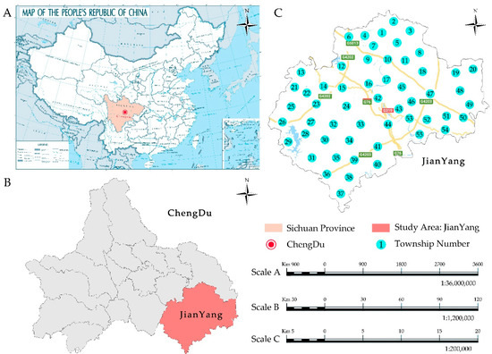The location of the study area. (A) Location of Chengdu city in China. (B) Location of JianYang County of Chengdu city. (C) Administrative division of the study area: JiangYang County. (The maps were created in ArcGIS software Version 10.2. A high-resolution image can be found in Supplementary Materials).