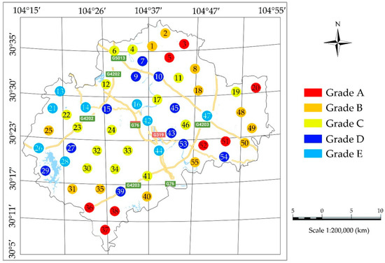 In order to better display the different improvement grade of the 55 townships, the author drew an improvement grade map of the human settlement environment (THSE) by using the map and color annotation method in JianYang County, as shown in Figure 3. The number in the figure represents the township code number, and the circled background color represents the improvement grade.