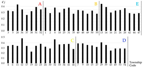 In order to further determine the order of improvement of the human settlement environment (THSE) in the 55 townships, the author made a horizontal comparison of townships under the same improvement grade. According to the theory of fuzzy mathematics, the larger the value of the factor cg in the comprehensive evaluation matrix C, the more urgently the research object needs to be improved. The horizontal comparison diagram is shown in Figure 4.