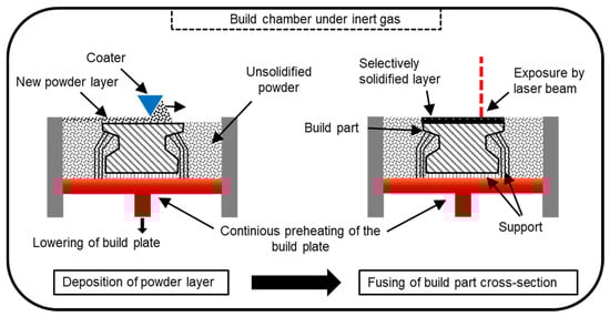 The metallic samples were manufactured using the PBF-LB/M system TruPrint 1000 of Trumpf (Germany). The TruPrint 1000 is equipped with an Nd:YAG fiber laser (wavelength of λ = 1064 nm) with a maximum laser power of 200 W and a focal diameter of 30 µm. An F-theta lens ensures that the focal point of the laser beam is positioned in the working plane. The system enables a maximum build size of 100 mm (diameter) and a height of 100 mm. Furthermore, the components and the powder inside of the build chamber are protected against oxidation by a nitrogen atmosphere. Figure 1 illustrates the schematic diagram for PBF-LB/M processes. The recoating mechanism consists of a rubber x-profile and distributes a thin layer of metal powder from the feed region over the build platform. Afterwards, the applied layer is selectively molten according to the cross-sections of the parts and metallurgically bonded to the underlying layer. As soon as this step is completed, the build platform is lowered and a new layer of powder is applied. These steps are repeated until the parts are finished.
