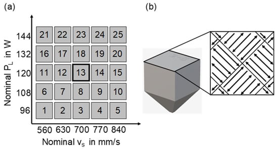 (a) Experimental setup with 25 samples with a varying nominal laser power PL and a varying scanning speed vs. Sample #13 represents the standard parameters of the used PBF-LB/M system. (b) 3D model of a sample with an illustration of the checkerboard scan strategy.