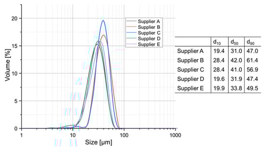 All powders were characterized by a Gaussian-like particle size distribution. Differences concerning the d10, d50, and d90 values were noticeable as depicted in Figure 3. Suppliers A, D, and E exhibit a decreased particle size distribution (d50) of approx. 10 µm in contrast to the powder provided by suppliers B and C. Furthermore, a multimodal particle size distribution was visible with an increased volume at 8–10 µm and 10–15 µm at powders C and D, respectively.