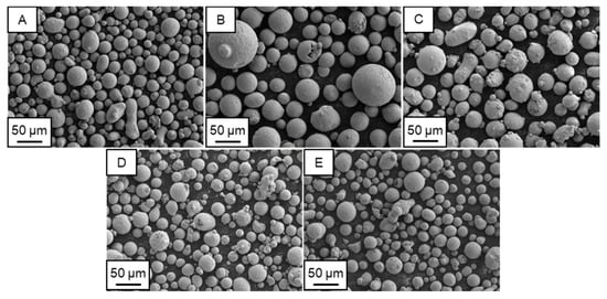 The SEM images (cf. Figure 4) confirm the increased amount of smaller particles. In total, the predominant amount of particles exhibited an almost spherical shape. The powder of supplier A was characterized by an increased amount of spherically shaped particles in contrast to the powder of supplier C. Here, the surface of most particles was not smooth due to particles covered by a large number of small satellites and also partially agglomerated particles. Furthermore, particle clusters and irregularly shaped particles were visible. Most of the particles of powder B were spherically shaped. Nevertheless, a small amount of satellites were recorded. The powder of supplier D was characterized by an increased amount of small particles that formed irregular clusters. Particles with a diameter of about 50 µm contain had increased presence of satellites. The predominant amount of particles provided by supplier E showed a spherical shape and contained smaller particles with a diameter of approximately 10–20 µm. Furthermore, the surface of the particles was smooth. The SEM images correspond to the calculation of the sphericity (cf. Table 3). The increased sphericity of powder B with a value of 0.94 and the decreased values of powder C and D, 0.87 and 0.89, respectively, were noticeable. The best sphericity of 0.94 at powder B also resulted in the best flowrate (cf. Figure 5b).