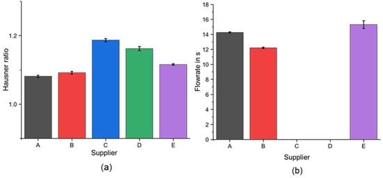 (a) Hausner ratio and (b) Flowrate of five different stainless steel 1.4404 powders.
