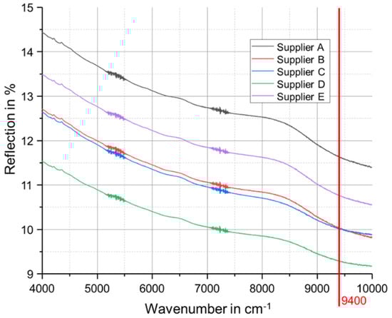 Absorption measurement of five different stainless steel 1.4404 powder feedstocks provided by different suppliers; Reflection was measured with respect to the wavenumber; wavenumber of 9400 cm−1 corresponds to a wavelength of λ = 1064 nm.