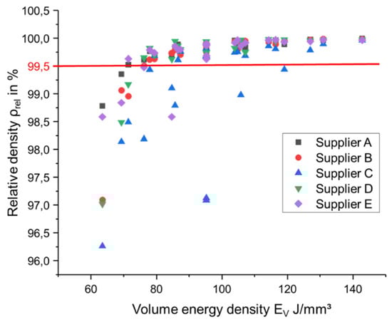 Figure 7 shows the tendency of the relative density according to the experimental setup. The section lined in red represents a process window that allows sample generation with a relative density ρrel ≥ 99.5%. An increased value of the relative density can simultaneously be registered to the increased volume energy density. The highest density is shown for all suppliers with the highest volume energy density (EV = 142.85 J/mm³). The diagonally arranged samples (sample #1, #7, #13, #19, and #25) were produced with the same volume energy density (EV = 95.23 J/mm³). Overall, samples of supplier C had the lowest density with an average value of ρrel = 99.11% and showed an inconsistent behavior compared to other sample groups. Samples of supplier A showed the highest average value of ρrel = 99.77%. Furthermore, it was evident that powders provided by suppliers A, B, and D exceeded the border of ρrel = 99.5% with a volume energy density of EV < 80 J/mm³. By increasing the scanning speed of the laser by 10% compared to standard parameters, the same density values could be achieved with powder A and B. Powder D exhibited a constant relative density with a 10% decrease in laser power.