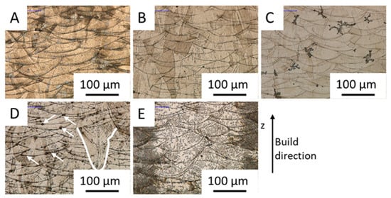 The periodic melt pool geometry of the manufactured samples becomes noticeable after etching and shows that particles have fused within the molten and solidified zones (cf. Figure 8) [16]. The layer upon layer manner and the overlap of adjacent laser scan tracks of sample #13 are presented. The designation of the samples corresponds to the designation of the suppliers. The structure occurs due to the partial remelting of the laser scan tracks [24]. The average melt pool width of sample #13 manufactured with powder D and B was approximately 150 µm and 148 µm, respectively, which represent the highest widths. Sample #13 manufactured with powder C was characterized by the lowest average value of 128 µm. Despite a focal diameter of 30 µm, increased melt pool widths were observed at the investigated levels of powder materials. This could be related to an increased power density. According to Hitzler et al. [33] and Casati et al. [24], subsequent heat inputs by the generation of the adjacent scan track or the subsequent layer changes the grains of the already solidified material, which is also called epitaxial growth and describes the tendency of needle-like grain growth along the direction of the maximum temperature gradient. The large number of inclusions in sample D and the irregular arrangement of the melt pools are conspicuous. The effects are particularly represented at the boundaries of the melt pools (white arrows in Figure 8). In addition, some microcracks are visible.