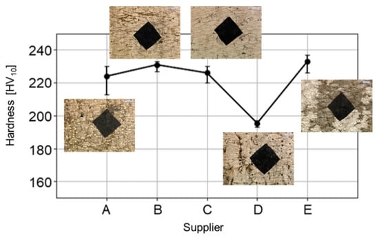 A hardness test was performed on the samples produced with standard process parameters (sample #13) of the PBF-LB/M system. The hardness test results showed comparable values for samples from suppliers A, B, C, and E (cf. Figure 9). Only sample D had a significantly lower value. The mean value of five measurements was 195.4 HV10 and is therefore approximately 19% lower than the highest mean value of sample E.