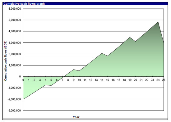 From the cash flow diagram depicted in Figure 5 using RETScreen, it can be estimated that it takes 7.2 years for cash flow to become positive and that the simple payback period will be 6.9 years. From the financial viability analysis, we get a Net Present Value (NPV) of BDT 855,428 (USD $10,183.67) and annual life cycle saving is BDT 73,405 (USD $873.87) and equity payback period is 7.2 years. In terms of the project’s economics, we can say that the proposed hybrid system is the most economical one because after 7 years the project will start to generate profit and reduce the system’s overall costs.