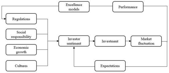 In addition, we also summarize the roles of some external factors in the interaction mechanism between stock investor sentiment and market returns. Changes in policies and regulations alter investors’ perspectives of market trends along with their investment behavior [4]. The authorities assess the efficiency of regulations and make adjustments according to market performance and the criterion of some excellence models [71]. Recognizing the importance and advantages of social responsibility and of sustaining market efficiency in increasing profits, productivity, and performance, many organizations and individuals make their investments at the level of social responsibility. This reduces the emergence of extreme investment sentiments and decreases market fluctuations [21,72]. A slowdown in economic growth can lead to pessimistic expectations of investors about the future and overreaction to their investment behavior, which can cause market fluctuations [73]. Moreover, the cultural traits of different regions potentially have an influence on investor sentiment and lead to market changes. A conservative personality and investment style may be more prone to pessimism [74]. Figure 1 shows these external factors in the interaction mechanism between stock investor sentiment and market returns.