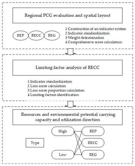 Figure 3 describes the procedures for determining REP, RECC and REG. This framework establishment process generally consists of three steps and is conceptually straightforward. On the basis of the PCG conceptual model, the first step is the construction of an indicator system, assessment of the REP, RECC and REG levels and analysis of the differences amongst regions. The second step is the analysis of the limiting factors of RECC. The last step is the identification of the regional potential and utilization direction based on the coupling types of the REP, RECC and REG.