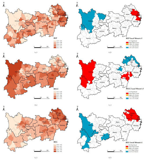Local indicators of spatial association (LISA) is used to further analyse the spatial distribution rules of the PCG indicators for the YREB (Figure 4d–f). The LISA value is an indicator to measure the degrees of similarity (positive correlation) and difference (negative correlation) between spatial unit attributes and surrounding units. Four categories, namely, High-High, High-Low, Low-High and Low-Low, were clustered based on the LISA statistics. The local spatial autocorrelation shows that the hotspot clusters (High-High areas) of REP indicator are mainly distributed in southern Jiangsu, northern Zhejiang and Shanghai in the lower reaches of the Yangtze River. In contrast, the cold spot clusters (Low-Low areas) are mainly distributed in Sichuan in the upper reaches. The hotspot clusters (High-High areas) of the RECC indicator are mainly distributed in western Sichuan, northwest Yunnan and northern Jiangxi, while the cold spot clusters (Low-Low areas) are mainly distributed in Jiangsu, Shanghai, northern Anhui, and eastern Hubei in the lower reaches. The hotspot clusters (High-High areas) of the REG indicator are mainly distributed in Jiangsu, Shanghai and eastern Anhui in the lower reaches area, while the cold spot clusters (Low-Low areas) are mainly distributed in the upper reaches, such as Sichuan, Yunnan and Guizhou. Generally, the REP indicator is larger in the lower reaches than in the upper reaches. The RECC indicator is larger in the upper reaches than in the lower reaches. The REG indicator is larger in the lower reaches than in the upper reaches. The resources and environmental pressure levels of the YREB do not match the carrying capacity but do match the governance level.