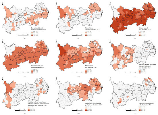 Figure 5a–c shows that, in terms of the three single factors of land resource carrying capacity, the cities limited by the indicator of per capita cultivated land area are distributed in Zhejiang, Jiangxi and Hunan in the lower reaches of the Yangtze River. Meanwhile, the cities limited by the forestland area ratio indicator are mainly distributed in Sichuan in the upper reaches and Jiangsu and Anhui in the lower reaches. Except for some cities in the upper reaches of the Yangtze River, other cities in the zone are limited by the ratio of unused land. These regions should enhance the protection of cultivated land, forestland and unused land, as well as restrict the unlimited expansion of construction land in the future. Insufficient unused land has become an important limiting factor for the land resource carrying capacity of the YREB. Figure 5d–g shows the four limiting factors of the water resource carrying capacity. The majority of the cities in the zone are unexpectedly limited by the indicators of the per capita water resource and ratio of water area. Moreover, the majority of the cities in the upper reaches have a comparatively low matching degree with their agricultural water. The domestic and industrial water in Sichuan and Yunnan in the upper reaches has a comparatively low matching degree with the land for mining and industry. Therefore, focus should be directed to the reasonable exploitation and protection of the YREB’s water resources. The cities limited by the atmospheric environmental quality index, such as Chongqing, Hubei, Anhui, and Jiangsu, are mainly distributed in the middle and lower reaches (Figure 5h). Moreover, attention should be directed to the atmospheric governance and environmental protection of these regions. The few cities limited by the water environment quality index are mainly distributed in Jiangsu, Anhui and Yunnan (Figure 5i). Accordingly, effort should be exerted to protect the water environment quality in these regions.
