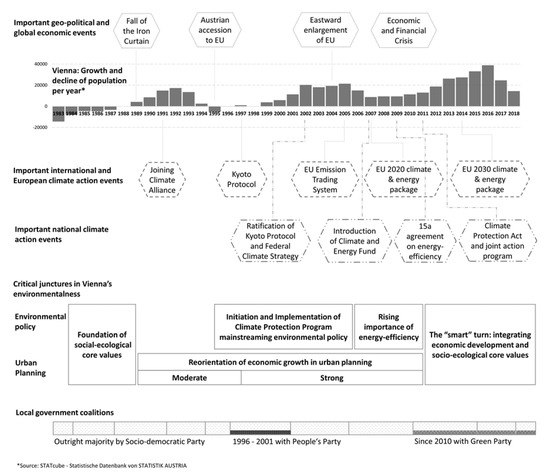 Vienna’s problem-solving attitude was influenced by three main junctures between 1989 and 1999: the fall of the iron curtain in 1989, the City’s membership in the Climate Alliance in 1991, and Austria’s accession to the EU in 1995 (see Figure 1). The Department for Urban Planning problematized the fall of the iron curtain as a profoundly new geo-political situation, where population growth was to be expected [49]. Similarly, the City saw Austria’s imminent membership in the European Union in 1995 engendering “intensified competitive conditions, also for Vienna” [49] (p. 1). Municipal policy–making aimed at developing Vienna as a regional centre in Central Europe and embraced moderate economic modernisation, while trying to compensate the negative social and ecological effects of economic development and population growth [50] (p. 138). Consequently, Vienna’s “ecologically sensitive and health-oriented urban development” continued to support socially oriented urban renewal, and to ensure green space development and protection, and high-density and mixed-use housing on inner-city brownfields through zoning [49] (p. 55 ff). The expected population growth, however, led the City to develop new neighbourhoods at the city fringes. These developments still followed the City’s ecological agenda that promoted dense urban structures in combination with good connectivity to low-carbon transport.