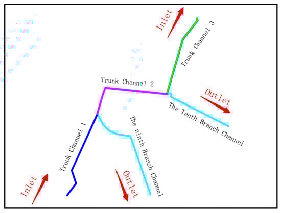Yintang Irrigation District is located in Tangyuan County, Heilongjiang Province, China. The Tangwang River is the main source of irrigation water in this region. Its north trunk channels and the ninth and tenth branch channels were selected as the simulation region. A schematic diagram of the channel arrangement is shown in Figure 2. The mathematical model of the river network water supply in the above-mentioned areas was established using MIKE 11 software. The actual flow of water in each channel within 200 min was calculated through the generalization of the river network and the river section and the setting of internal and external boundaries. At the same time, the model calculation results were compared with the measured data of the channel, shown in Figure 3. The results showed that the model can reflect the motion characteristics of the river network in the region and verified the rationality of the model. It was applied to the verification calculation process of the water distribution scheme in the Xiying Irrigation District.