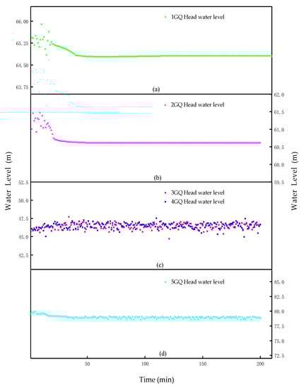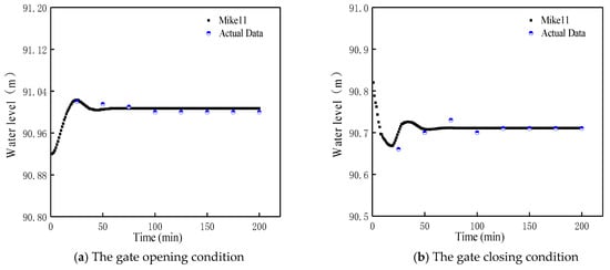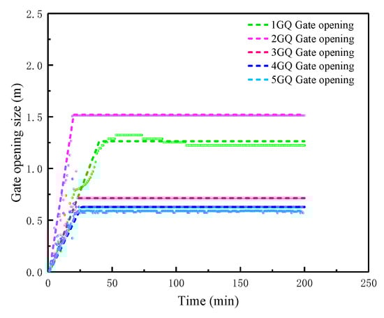 Figure 7 reflects the changes in the water level in the heads of the five branch canals. The head water levels of each canal had gradually transitioned to a stationary stage after certain fluctuations, as shown in Figure 7a,b,d. The canals “3GQ” and “4GQ” (as shown in Figure 1) were connected to the end of the main canal to form a Y-shaped channel; therefore, the water levels were different before the gate, which are shown in Figure 7c. The water level fluctuated continuously in 200 min simulation time and was difficult to stabilize. Canals 3GQ and 4GQ were located at the end of the primary canal; therefore, the water transfer operation process of the main canal and other secondary canals greatly affected their water level. There were constant fluctuations in the water level before the gate. Figure 8 shows that the flow discharges varied with time at the end of each secondary channel in the BSA model. The optimization results met the field requirements, and the water was supplied to the sub-regions. The change in the opening degree of each channel gate was calculated according to the calculation correlation of the gate opening degree and the simulated data (as shown in Figure 9). The scattered point, in Figure 9, represents the calculated value and shows that it was fitted into the actual running process of the gate (the solid line represents the fitted value), which was basically in line with the running requirements in the actual situation.