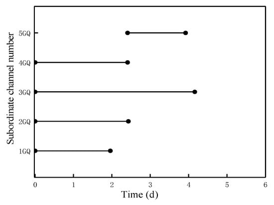 The simulation area adopted relative elevation. The relative elevation in the simulation starting point of the total main channel was set to 100 m, while other required elevations were calculated according to the longitudinal slope. The simulation duration of each channel was set to 200 min, the time step was taken for 1 s and the downstream normal water depth operation mode was adopted. The upstream flow of Canal ZGQ (as shown in Figure 1) was set to a design flow of 8.41 m3/s by considering the efficiency of irrigation. The water flow dispatched from other branch channels was allocated according to the optimized water distribution scheme, i.e., the gate of each tributary was opened and closed according to the time shown in Figure 4, while the diversion flow of each branch canal was increased from 0 to the operating flow (as shown in the column in Figure 5) and remained stable. The calculations were performed according to the above conditions and the simulation results are shown in Figure 7.