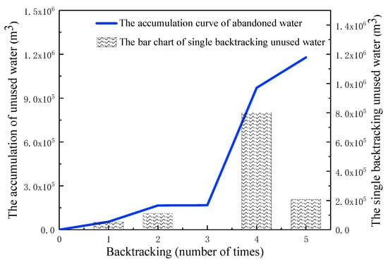According to the water distribution requirements of the Xiying Canalization in 2008, it was ensured that the irrigation time was controlled within 15 days. The irrigation water distribution time and flow rate (as shown in Figure 4 and Figure 5, respectively) were obtained by the BSA model using the basic parameters as input. Under the constraint of meeting the 15 days upper limit of irrigation time, the BSA model selected the irrigation sequence of each branch canal, gave the corresponding irrigation start and end times and also reduced the irrigation cycle, as shown in Figure 4. Figure 5 shows the respective working flow of the five branch canals, which met the constraints of the no-rush and no-sediment operations of the channel. It was in line with the actual operation of the field. The bar chart of the amount of unused water obtained under single backtracking is shown in Figure 6. This meant that the amount of unused water was uneven, which was due to a higher number of available branch canals using the BSA model in the early stages. Therefore, it was easier to make the remaining flow reach zero in the unit time. The accumulation curve of unused water, shown in Figure 6, showed that there was a pause platform in the third retrospective, which was due to the fact that the time used for the ten times backtracking was extremely short. Even if the flow rate of the unused water was high, it was impossible to accumulate a large amount of unused water in a short time.