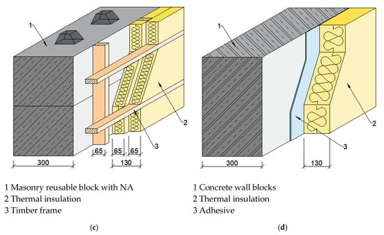 In this study, four construction types were marked as Plan 1, Plan 2, Plan 3, Plan 4. The first construction (Plan 1) combined regular insulation and reusable blocks, which were made of the concrete mixture with recycled brick aggregate. Similarly, Plan 2 construction consisted of reusable blocks made of recycled concrete aggregate. Reusable blocks with thermal insulation were also used in Plan 3, but for this construction, a concrete from primary resources was used. Plan 4 was a regular reinforced concrete wall system with thermal insulation and adhesive. Constructions with reusable blocks included timber frames. All of the constructions had similar thermal insulation properties. The heat transfer coefficient for all Plans was 0.29 W/m