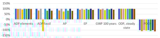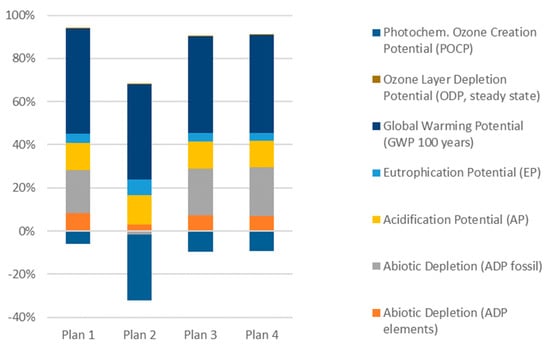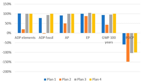 Each of the plans had a beneficial impact on the POCP category. The main effect on this category was caused by transport processes, which were modeled as diesel trucks (Euro 3). After combustion in the diesel engine, emissions of NO