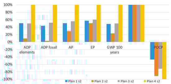 Table 10 show that Plan 2 s2 was still the most favorable scenario. In comparison with other scenarios, it had a more negative impact, only in the ODP category. The worst construction was Plan 4 s2, which potentially caused almost double the impact than in the first scenario.