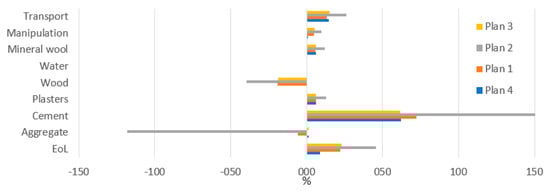 Recycled brick aggregates in Plan 1 came from the recycling of brick CDW, which did not contain such a large amount of steel scraps like in Plan 2. Therefore, these recycling processes did not significantly affect the environmental impact of Plan 1. In these basic scenarios, Plan 3 and Plan 4 were almost similar, hence their environmental impacts were almost equal, too. The only exception was in the ODP category. This difference was caused by the process of incineration of the construction wood, which was used only in the other three plans.