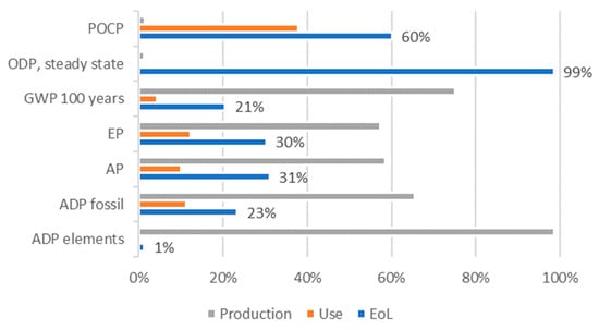 In the abovementioned LCA studies, the environmental impacts are assessed using different characterization methods. One of the used methods is the the characterization method of Institute of Environmental Sciences (CML2001). The characterization factors of this method are used also for environmental assessment of construction products according to EN 15 804 + A1. In this study, the results were performed using CML2001—January 2016. Nevertheless, this method uses characterization models, which insufficiently describe the environmental impacts in some categories, such as the Photochemical Ozone Creation category. Therefore, this study also used the method of National Institute for Public Health and the Environment (ReCiPe 2016 v1.1) as characterization method and both sets of results were interpreted together.