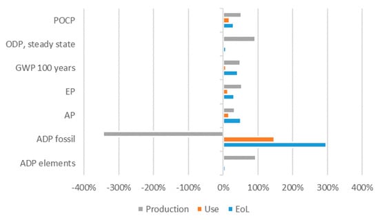 Figure 2). The normalization was carried out with data from CML2001—January 2016, World, year 2000, including biogenic carbon (global equivalents) and the weighing was carried out according to thinkstep LCIA Survey 2012, Global, CML 2016, including biogenic carbon (global equivalents weighted). No data for the normalization and weighing according to ReCiPe 2016 were available.