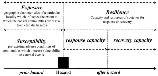 Figure 1 illustrates the interrelationships between these three key components. It depicts how each component can be classified in relation to specific time periods, prior to or after a hazard event [62]. Informed by the academic literature (see, for example, [63,64,65,66,67]), we suggest that exposure and susceptibility are related to the characteristics of the system prior to the hazard event. In contrast, resilience, being linked to coping and response capacity, is related to the system’s ability to absorb and recover from the impacts, i.e., post the hazard event.