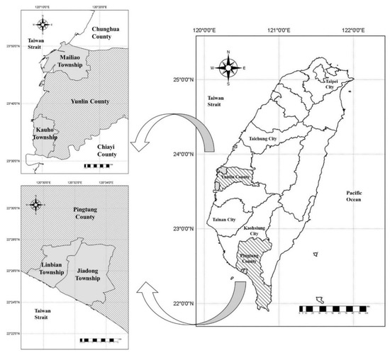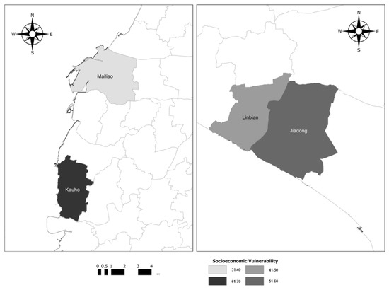 Given the study’s need to identify and characterize the specific vulnerability of different coastal communities, as well as the study’s intention to demonstrate the importance of socioeconomic vulnerability in local adaptation frameworks, the SVIF was conducted at a township level. To ensure that the study addressed the “exposure” component of vulnerability, it needed to include several case studies that exhibited varying combinations of hazards and geographic characteristics. Consequently, two coastal townships in Yunlin County (the Mailiao and Kouhu townships) and two townships in Pingtung County (Linbian and Jiadong townships) were selected (Figure 2). These encompass significant areas at risk from severe land subsidence (the annual average subsidence rate exceeds 3 cm) [15] and flooding.