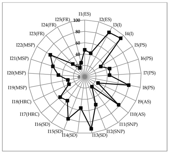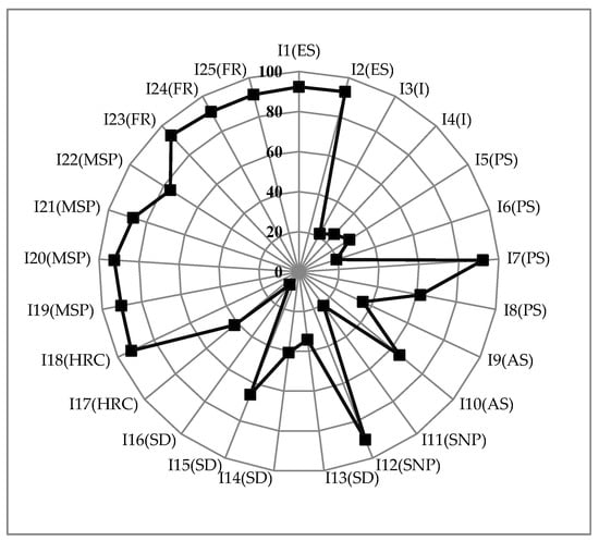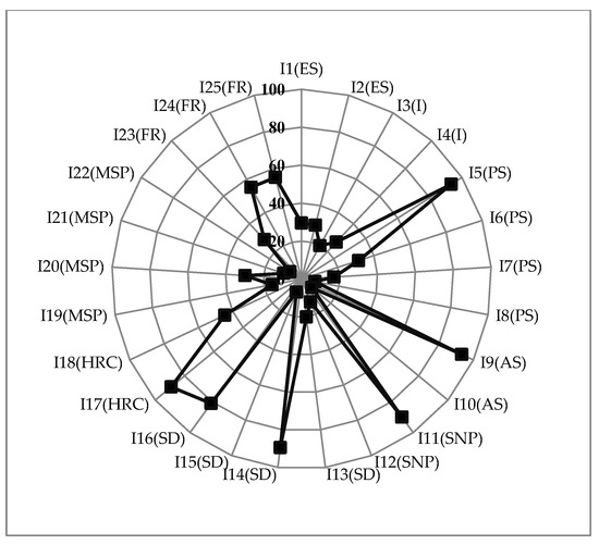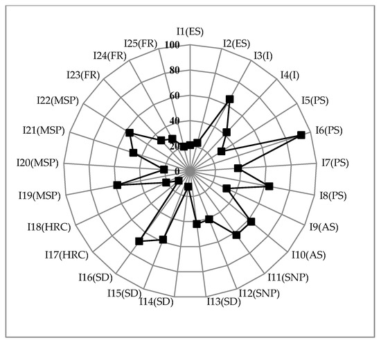 Kauho’s vulnerability is clearly linked to its higher scores across most of the indicators compared to the other townships. The figures illustrate the salient driving factors of socioeconomic vulnerability for the different coastal communities, with the radar diagrams enabling the reader to quickly identify the indicators that contribute to high vulnerability scoring indicators. For example, the figure for Kauho (Figure 4) shows a more uniform pattern of vulnerability compared with the spikey chart for Mailiao (Figure 5). In addition, it is relatively easy to pick out the indictors that contribute to each township’s vulnerability from these charts: In the case of Kauho, for example, Figure 4 highlights the township’s high level of vulnerability that is associated with indicators that are related to medical service provision (I19-I22), financial support (I23-I25), and economic structure (I1-I2). In contrast, the relatively less vulnerable township of Mailiao still displays some vulnerabilities, as highlighted by the occasional ‘spike’ in the radar chart (Figure 5). These are particularly related to the demographics of the township’s population, notably its age structure (I9), excessive population growth (I5), and high dependency ratio (I14) caused by its youthful population.