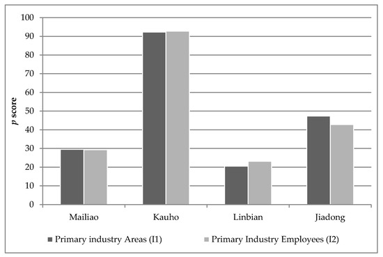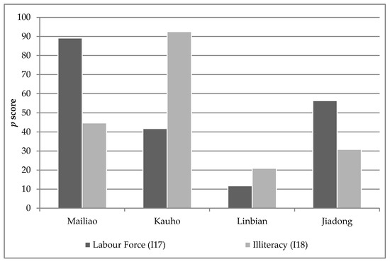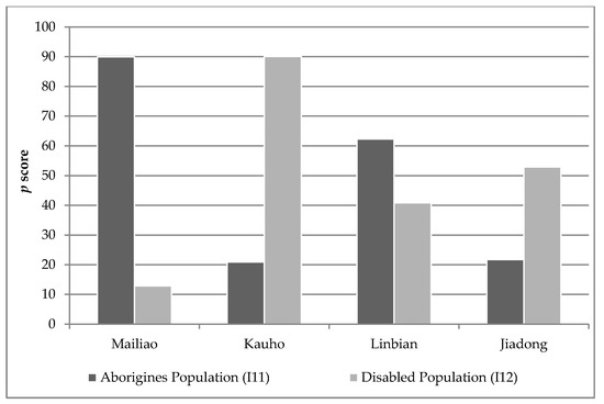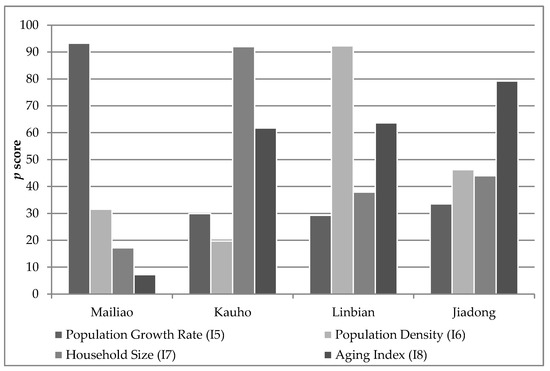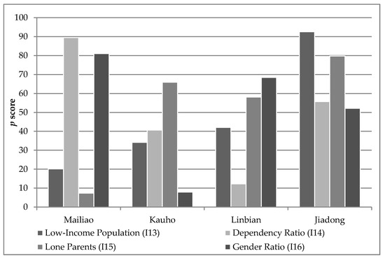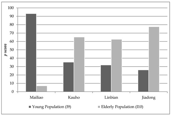 In detail, Figure 12 reveals a distinct difference between Mailiao and the other townships in terms of their age structure. Two groups, the young and old sections of society, are particularly vulnerable to external hazards and require specific assistance. The high young population (I9) in Mailiao and the large proportion of elderly people (I10) in the other townships (Kauho, Linbian and, Jiadong) are notable. The latter, which clearly corresponds to the previously mentioned high aging indices, is a major issue because of the demands that elderly populations place on social welfare provisions [96,97].
