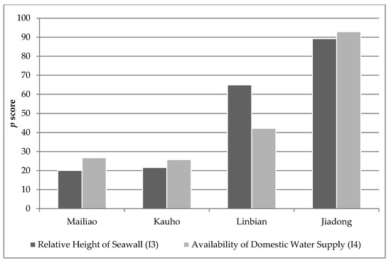 In contrast, Figure 10 highlights the higher levels of susceptibility for Linbian and Jiadong in relation to the two infrastructure indicators, the ‘relative height of the seawall’ and the ‘availability of domestic water supply.’ Both are critical factors that hinder the protection of local economic activities and public security. Compared with the first theme, there is slightly greater variation between the findings for each indicator, particularly for Linbian.
