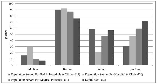 Figure 16 reveals unequal provision of medical resources across the townships. Given the likely relationship between medical resource provision and socioeconomic vulnerability to climate change, Miliao, with a higher medical resource provision and lower death rates than the other townships, is the most resilient. The Kauho township is the most vulnerable. Insufficient medical facilities (I19), hospitals and clinics (I20), and medical personnel (I21) in this township, as well as in Linbian and Jiadong, are also accompanied by high death rates (I22), suggesting high levels of potential vulnerability across all three townships [21,103]. The previously noted higher proportion of elderly people in the rural areas clearly influences death rates and creates a high demand for the provision of medical services.