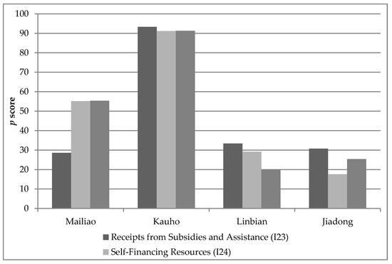 From the perspective of financial resources, Figure 17 reveals that Kauho is potentially most vulnerable to climate change. There is a high dependency on subsidies and assistance from the central government (I23), as well as insufficient self-financing resources (I24) and taxes (I25) in this township. Mailiao has a similar profile with respect to self-financing resources and tax receipts, potentially indicating that this township may also have a reduced resilience to climate change. Such results are not surprising given the suggestions by Xu [104] and Jang [105] that local government financial resources are not unrelated to population structure and economic development in Taiwan. Indeed, it is likely that the high dependency of Kauho on primary industrial activity (Figure 9) and its high proportion of elderly people (Figure 12) contribute the township’s financial shortfall.