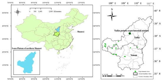 The experiment was conducted in 10 counties in China’s Loess Plateau region from 2017 to 2019 (36°40′–39°21′ N, 108°46′–109°44′ E, altitude of 772–1320 m above sea level), which belongs to the typical loess hilly landform of loess tableland, with arid and semi-arid continental monsoon climate (Figure 1). The average annual rainfall ranges from 300 to 700 mm. The average annual temperature is 9 °C. The no-frost cycle ranges from 156 to 205 days. The soil type mainly includes the yellow spongy soils and the wind sand. The average sand, silt, and clay contents in the 0–80-cm soil profile was measured with a laser particle size analyzer (Dandong Haoyu Technology Co., Ltd.), and the values were 53.2%–81.1%, 11.32%–3.2%, and 7.6%–21.4%, respectively.