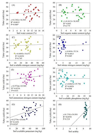(Figure 2G) were significantly correlated with potato yield, while potato yield was not significantly correlated with other soil nutrient contents. Potato tuber yield increased with the increase of soil water content, soil available nitrogen content, soil nitrate nitrogen content, soil ammonium nitrogen content, soil available potassium content, and pH (Figure 2). The potato tuber yield decreased with the increase of soil organic matter content and soil available phosphorus content (Figure 2). The maximum determination coefficient (R2) of potato yield and soil available potassium content was 0.169 (Figure 2G).