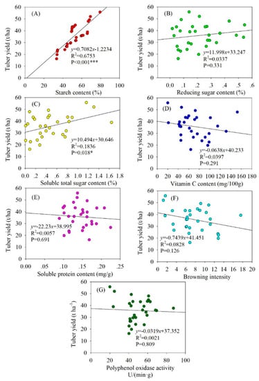 Linear regression analysis of potato yield and starch content (A), reducing sugar content (B), soluble total sugar content (C), vitamin C content (D), soluble protein content (E), browning intensity (F), polyphenol oxidase activity (G). ***, **, and * indicate significance at p < 0.001, p < 0.01, and p < 0.05, respectively. The linear regression value of each slope is obtained according to the homogeneity test of regression coefficient.