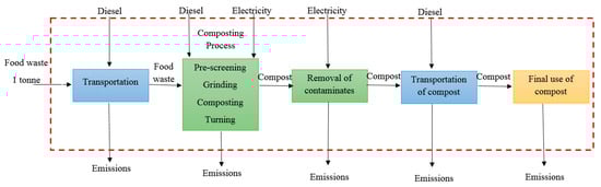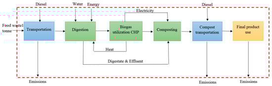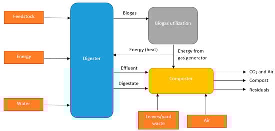 Anaerobic digestion is a complex series of reactions where organic material is degraded by microorganisms in the absence of oxygen. The process generates biogas, which is a mixture of methane and CO2, and a residual biodigestate that may be used as fertilizer. Anaerobic digestion and composting are separate systems but when combined together they can enhance the performance of both systems and yield environmental benefits. Some of the waste product from digestion will become an input for the composting process and vice versa. As such, the adoption of the integrated system will result in more useful products and the generation of less waste [37]. Figure 3 illustrates the system boundary of the integrated anaerobic digestion combined composting and windrow composting evaluated in this study.