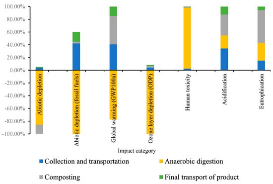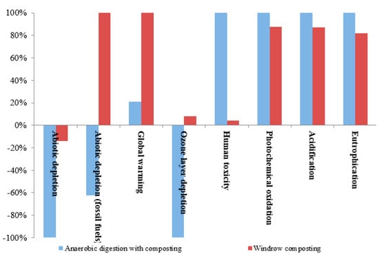 The results of the LCA impact assessment for the two processes are presented in Figure 5, Figure 6 and Figure 7. Figure 5 illustrates the comparison between the two food waste management methods evaluated in this study in terms of the full range of impact categories assessed. The negative values observed in the results represent environmental benefits in the analyzed impact categories, while positive values refer to the negative environmental impacts. The ranking varies greatly between the assessed techniques. The impact categories for the integrated anaerobic digestion and composting system have been ranked. Evidently, it is the food waste management option that has the smallest contribution to the ADP, ADP–FF (from fossil fuels), ODP and GWP impact categories. By contrast, the windrow composting is identified as the food waste management option with the larger environmental burden as represented by the impact categories (Figure 5).