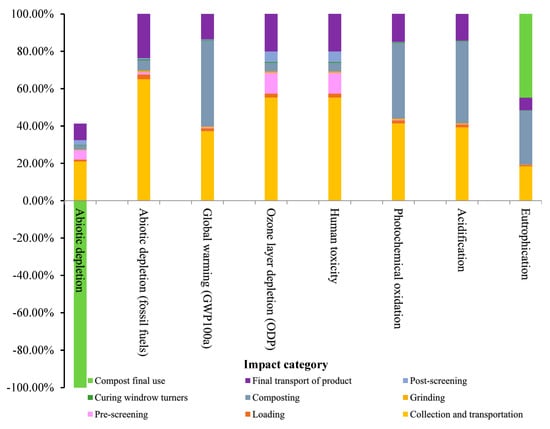 There are multiple environmental benefits when inorganic fertilizers are replaced with compost [46]. Table 6 illustrates the comparison of the environmental impact between the use of compost and inorganic fertilizer taken [47]. Most of the benefits are in reducing the production of nitrogen required for the mineral/inorganic fertilizer and in avoiding the subsequent application, in which nitrogen oxides will be emitted into the atmosphere. In the application of inorganic fertilizers, and because of the nitrification and denitrification processes, in addition to valorization, about 10% of the ammonia in the fertilizer will be oxidized into nitrous oxide (NOx), which is released into the atmosphere, contributing to acidification. In addition, the use of fertilizer produces N2O emissions during nitrification and denitrification in the soil which will contribute to the GWP. Furthermore, the aquatic eutrophication potential can be increased due to any phosphorus and nitrogen leaching into the aquatic ecosystem. Furthermore, excessive application of fertilizer can also negatively affect the crop production efficiency [46].