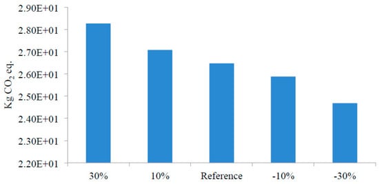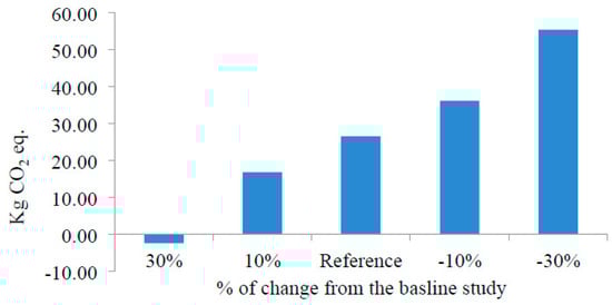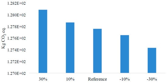 The amount of electricity and heat produced from biogas could avoid the production of an equivalent amount of heat from a non-renewable source such as natural gas. In the same way, it could be considered that the amount of electricity generated from the biogas could replace the same amount of electricity produced in the Qatar grid. The most important assumption concerns the quantity and quality of the energy substituted by that produced from biogas. In this study, electricity and heat production are modeled by expanding the system to evaluate the burdens avoided by substituting the energy input in the system by biogas generated from the digester. Because avoided electricity and heat have positive results for the environment, a bigger amount of electricity and heat avoided produce greater benefits to the environment, in the same way that a decrease in them causes an increase in the impact. Therefore, the results show that with a 30% increase in heat and electricity avoided, the impact on global warming decreases by 109.28%, and with a 10% increase, the impact decreases by 36.43%. A decrease of 10% in electricity and heat avoidance increases the global warming potential by 36.43%, and a decrease by 30% increases the global warming potential by 109.8%. Table 14 illustrates the total values of the global warming potential, as well as the sensitivity in percentage in relation to the reference scenario. Figure 10 presents the results of the sensitivity analysis for global warming potential.