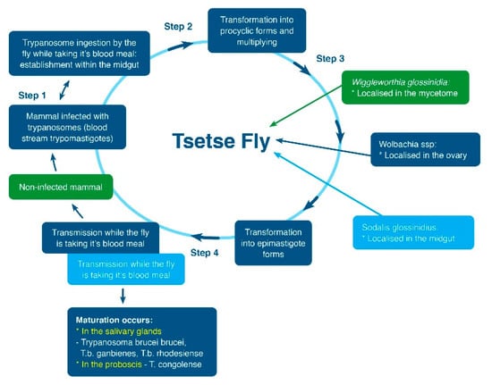 Both HAT and AAT are caused by flagellate protozoa transmitted by the tsetse [4]. The tsetse provides an ambient environment where the parasites complete their unique breeding life cycle (Figure 2). The flagellate protozoa infect a wide range of wild and domestic animals as well as humans in sub-Saharan Africa [5]. Infected livestock and humans present diverse clinical manifestations. For example, persons infected with sleeping sickness may experience multi-organ dysfunction, high-grade fever, dizziness and constipation [6,7]. In the case of one Polish tourist who experienced a tsetse fly bite in Queen Elizabeth National Park in Uganda, a high-grade fever was observed. The fever was preceded by chills, bleeding from the gums and oral mucosa. Haemorrhage at the sites of venepuncture, numerous ecchymoses, fine-spotted skin rashes and tachycardia were observed. In addition, hepatosplenomegaly, dehydration, jaundice, dyspnoea, hypoxaemia, generalised oedema and oliguria have been observed [6]. Additionally, livestock anaemia, lacrimation, enlarged lymph nodes, abortions and decreased fertility are signs associated with infected livestock. In other cases, infected livestock exhibited a loss of appetite, poor body condition and productivity and early mortality [8,9].