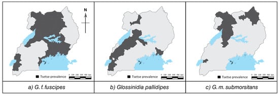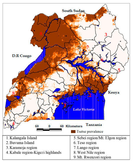 The tsetse phenomenon presents a high disease burden on the human population. This high incidence often leads to decreased agricultural productivity and livestock deaths [5]. Sleeping sickness is an important public health disease in sub-Saharan Africa. On the basis of the HAT related mortality, it has been ranked ninth out of 25 human infectious parasitic diseases in Africa [4]. Meanwhile, livestock nagana remains a major obstacle to livestock development in several sub-Saharan African countries. It causes the death of an estimated three million cattle annually. Furthermore, losses of approximately 26% in dairy yield and 50% of cattle herds in high potential agricultural areas are attributed to tsetse infestation. These losses lead to an estimated economic loss of US$4.5 billion annually in Africa [11,12]. In the case of Uganda, approximately 90% of sleeping sickness cases are caused by tsetse Glossina fuscipes fuscipes [3] and Glossina f. fuscipes and Glossina palidipes are known to occur in most of Uganda (Figure 3). The infection of livestock in cattle-rearing communities by nagana has led to a livestock crisis arising from livestock deaths and sale restrictions. This pattern has exacerbated food and nutrition insecurity [13,14]. Trypanosomiasis prevalence and resistance are predicted to become more pronounced and persistent in many African tsetse belts, signifying an aggravation of the phenomenon [15]. These patterns are attributed to changes in land use and cover as well as climate variability and change [16,17]. Evidence from within Uganda show treatment failure rates are as high as 30% in northern Uganda [18].