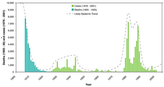 Over 70% (140,000 km2) of Uganda’s land area has been invaded by tsetse flies, but with varying levels of prevalence [19]. Uganda has approximately eleven tsetse fly subspecies. However, two species, Glossina f. fuscipes and Glossina palidipes, have received significant verification and documentation (Figure 3). G. f. fuscipes is the most abundant and widespread tsetse species and is found in approximately 70% of the country’s total infested area. Uganda is the only country in the region that has endemic foci of Trypanosoma brucei rhodesiense and T. b. gambiense [20]. Tsetse studies in Uganda have shown that the country has had three major epidemics of sleeping sickness since the 1890s (Figure 4). Over the years, the geographical extent of tsetse prevalence and trypanosomosis in Uganda has evolved. It has expanded from the traditional concentration in the Buganda sub-region (1905–1920) to the Busoga, south-eastern and mid-eastern parts of the Teso sub-region and the northern and West Nile areas of Uganda [3,21,22].